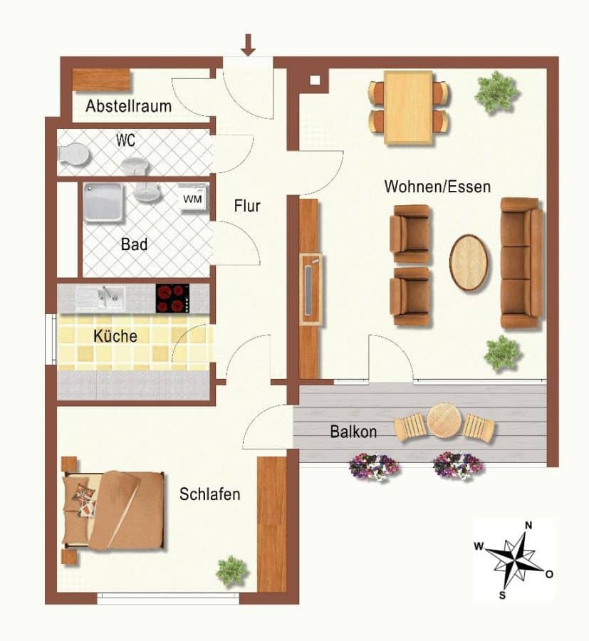 Wohn-/Esszimmer (ca. 22,52 m²), Schlafzimmer (ca. 14,81 m²), Küche (ca. 5,74 m²), Bad (ca. 3,87 m²), WC (ca. 2,30 m²), Abstellraum (ca. 2,07 m²), Flur (ca. 7,49 m²), Balkon (ca. 3,00 m² nach DIN ½.).