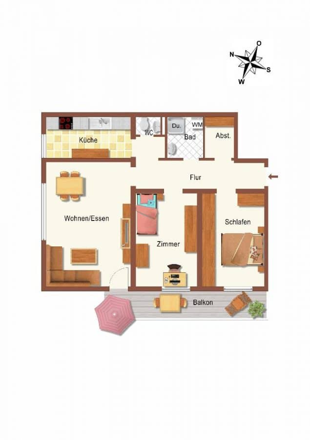 3 Zimmer, Küche, Bad, WC, Flur, Südbalkon, Abstellraum.
